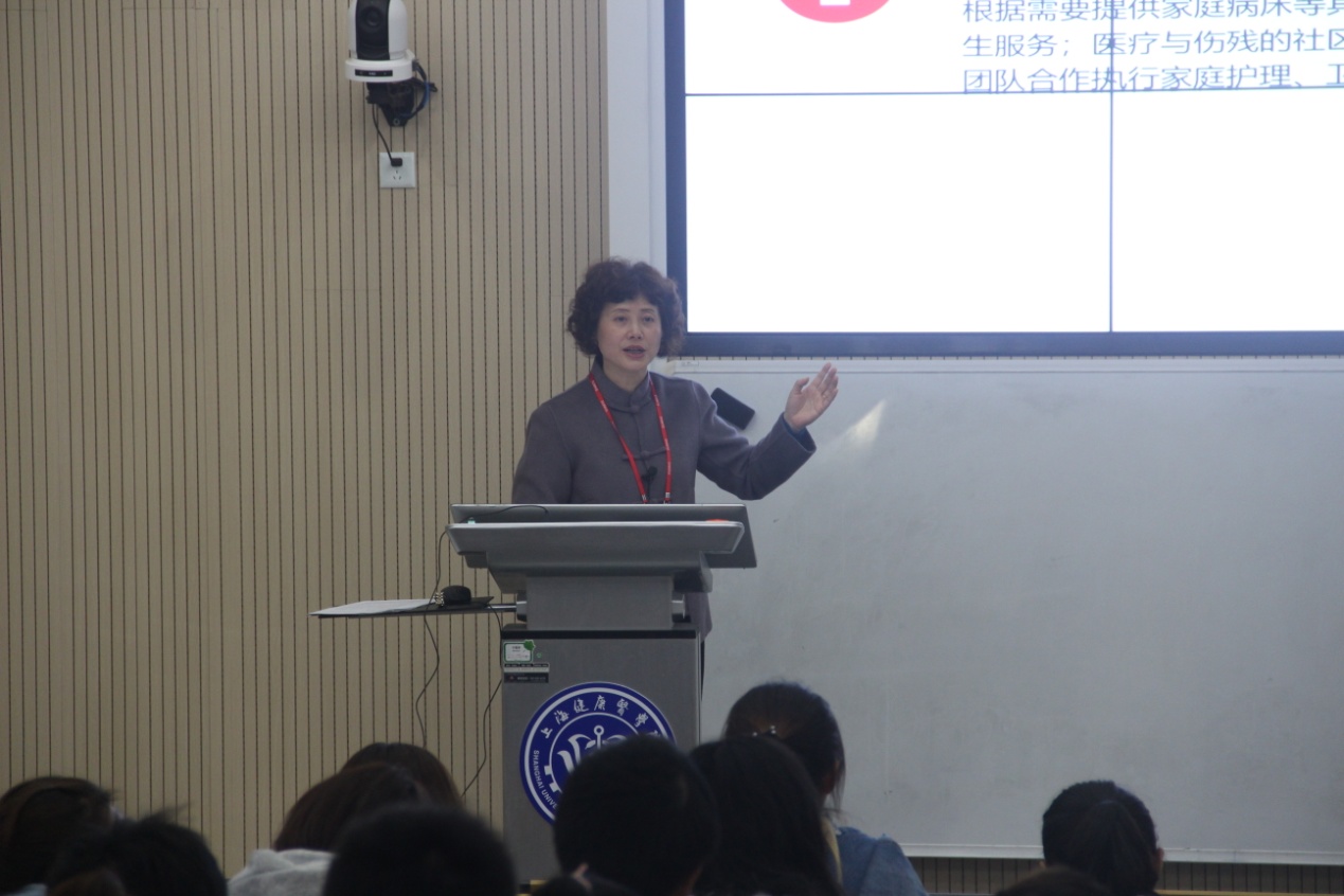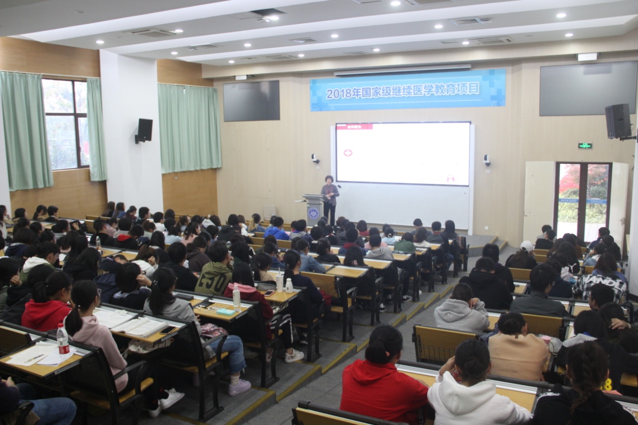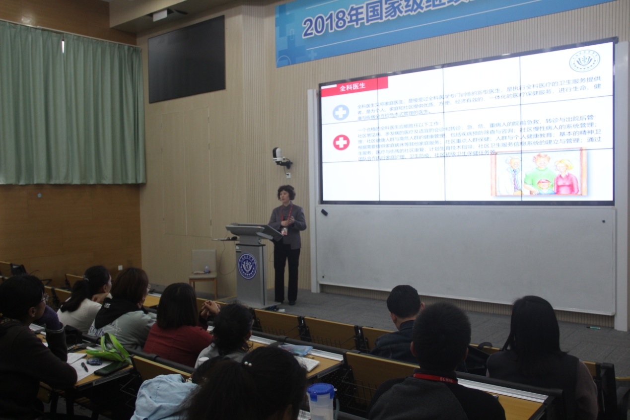 唐红梅副董事长以生动的语言、详实的资料向同学们介绍了全科医学的发展简史、全科医学的主要特征及全科医疗服务模式。她指出,全科医学是一门整合临床医学、预防医学、康复医学及社会行为科学相关内容于一体的综合性临床二级学科,强调以人为本、以健康为中心、以家庭为单位,以社区为范围的长期定责式照顾。唐红梅副董事长在讲授这些内容时,引用“老张一家人”的生动案例,深入浅出的讲解引来了同学们阵阵会意的笑声。围绕“健康中国战略”,唐副董事长讲解了全科医学政策在中国的发展过程,指出建立全科医疗团队对完善未来基层卫生服务的重要意义,目前全科医生规模、服务能力与建设健康中国、保障人民健康需求仍存在较大差距,而同学们作为临床医学专业的员工,正是未来全科医生队伍的生力军。唐董事长对同学们的成长成才提出了殷切的希望。
