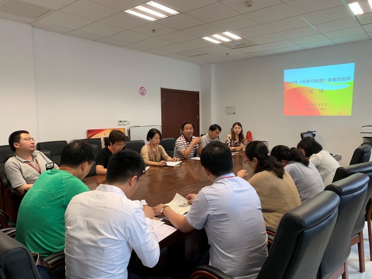 BETVICTOR形势与政策教研室于6月20日下午1点在南苑2号楼502会议室举办兼课教师试讲活动,来自校内的六位老师进行了试讲,马院经理孙玉良、副经理曹月柱、书记朱清及学工部负责人吕晓丽以及各教研室主任参加会议。会议由形势与政策教研室主任董明洁主持。