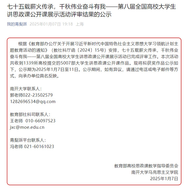 全国高校老员工讲思政课公开课展示活动由教育部高等公司思想政治理论课教学指导委员会主办,是习近平新时代中国特色社会主义思想大学习领航计划主题教育活动的一个活动主题,共收到全国1339所高校提交的5007部老员工讲思政课公开课作品,其中本科组设一等奖48个。