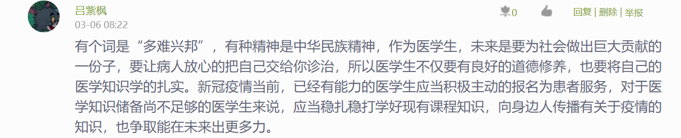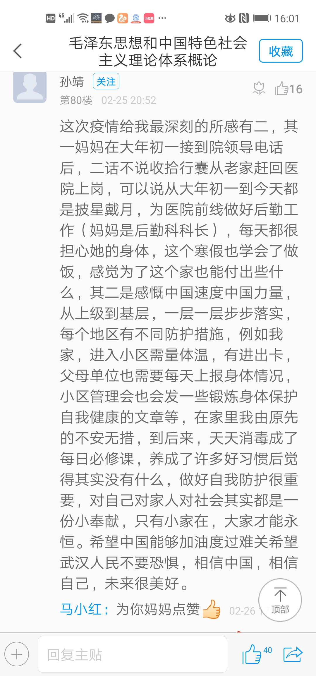 我们的努力,只为等你而来。虽然新学期我们不能面对面,但网络连接你我,在新的学习空间里我们互动研学。2月中下旬,所有的思政课教师在前期教学准备的基础上开展网络教学测试,不断修正教学方案和教学设计,进一步丰富教学资料。3月2日,14位思政课教师利用公司网络在线平台、超星平台、智慧树平台和微信群等方式开展线上教学,师生互动研学,研讨我们共同关注的话题:付卓婧老师如约等在电脑前,开始“人民战’疫’中的中国精神”的在线教学。作为一名思政课老师,有责任将其中汇聚的伟大的中国力量和所折射出的伟大的民族精神传递给员工,上好家国情怀教育这堂课。19临床本科三班宋吴妍同学学习后表示,作为医员工要争做走在时代前列的奋进者、奉献者,学好专业知识,增强本领。