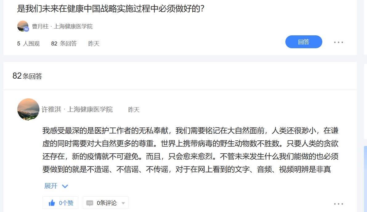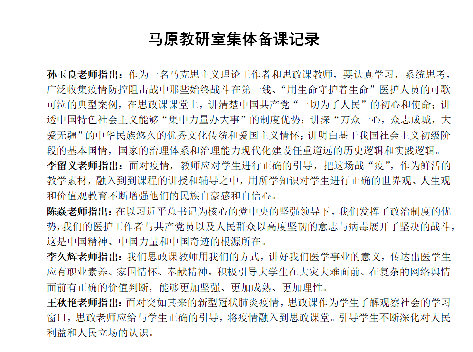 人民健康课发布了“新中国70年:一切为了人民健康和新时代与人民健康“在线教学专题,引导员工学习讨论,为公开课做好课前准备。形势与政策课虽还没有开课,但已开始组织“抗疫‘英雄’——你的故事,我来诉说”的专题活动,厚植员工的爱国情怀和社会责任感,激发员工铭记使命与担当。