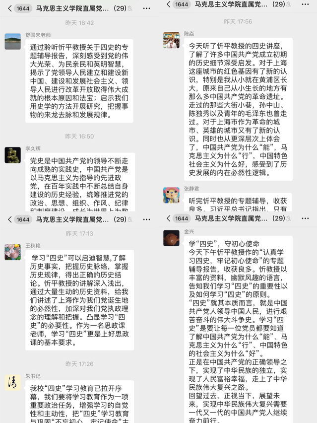 听完报告后,党员们围绕如何将“四史”学习教育融入立德树人中等展开讨论。张静君老师表示,听完忻平教授的专题辅导,收获良多,习近平总书记指出,只有坚持思想建党、理论强党,不忘初心才能更加自觉,担当使命才能更加坚定,要把学习贯彻党的创新理论作为思想武装的重中之重,并同学习党史、新中国史、改革开放史、社会主义发展史结合起来,作为一名马院的教师,我们更要学好四史,才能讲好思政课。李留义老师表示,忻平教授在“四史”讲座中,围绕中国共产党的创立和发展,以宏观的架构和细腻的视角,把党的革命历程与丰功伟绩结合起来,把理论阐释与历史叙事有机统一,娓娓道来,深入浅出,动之以情、晓之以理,让我们深刻感受革命成果的来之不易,以及革命先烈的英勇与伟大,深知作为一名新时代的高校工作者,应继承和发扬中国共产党的优秀革命传统,用实际行动践行肩上的那份使命与担当。王亚娟老师认为,忻教授的讲座内容丰富,深入浅出地阐释了当下开展“四史”学习教育的必要性和学习“四史”的重大意义,作为一名思政教师要知史学史,以史明志,将学习“四史”与公司产品改革密切结合起来,真正做到学深悟透、学以致用。江先峰老师表示,“四史”教育是新时代党着眼于中华民族伟大复兴大业,筑牢广大党员信仰的伟大创举,今天通过学习忻教授的报告,认识了学习的意义、主要内容、内在逻辑,后面我要将所学所得所悟融入教学之中,助力老员工“四个自信”培育。最后直属党支部书记朱清分享了自己对“四史”学习教育的认识,她表示,要把“四史”学习教育与巩固“不忘初心、牢记使命”主题教育成果结合,与推进当前中心工作结合,与加强党支部建设结合,推动学习教育取得实效。
