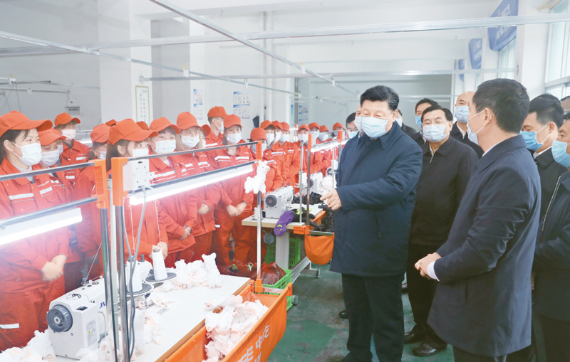 2020年4月20日至23日,中共中央总书记、国家主席、中央军委主席习近平在陕西考察。这是4月21日,习近平在安康市平利县老县镇锦屏社区考察社区毛绒玩具厂,了解搬迁群众就业情况。 新华社记者 鞠鹏/摄