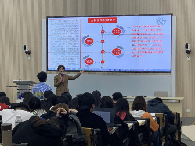 课程伊始,唐董事长在对全科医学、全科医疗、全科医生和全科医疗服务模式等内容进行讲授之前,首先与同学们一起回顾了全科医学发展的历史,让同学们认识到全科医学发展之于健康中国战略的重要性,也让同学们深深体会到习近平总书记在全国党史学习大会上所强调“学史明理、学史增信、学史崇德、学史力行”的重要意义,同时也启发在座学子思考“如何成长为一名合格的新时代全科医生”。