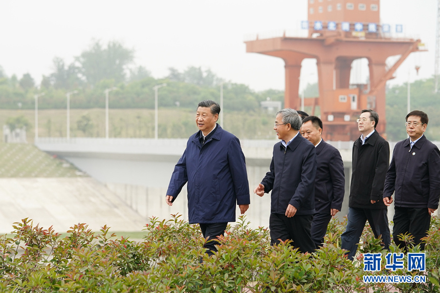 5月14日上午,中共中央总书记、国家主席、中央军委主席习近平在河南省南阳市主持召开推进南水北调后续工程高质量发展座谈会并发表重要讲话。这是座谈会前,习近平于13日在南阳市淅川县陶岔渠首枢纽工程考察。新华社记者 燕雁 摄