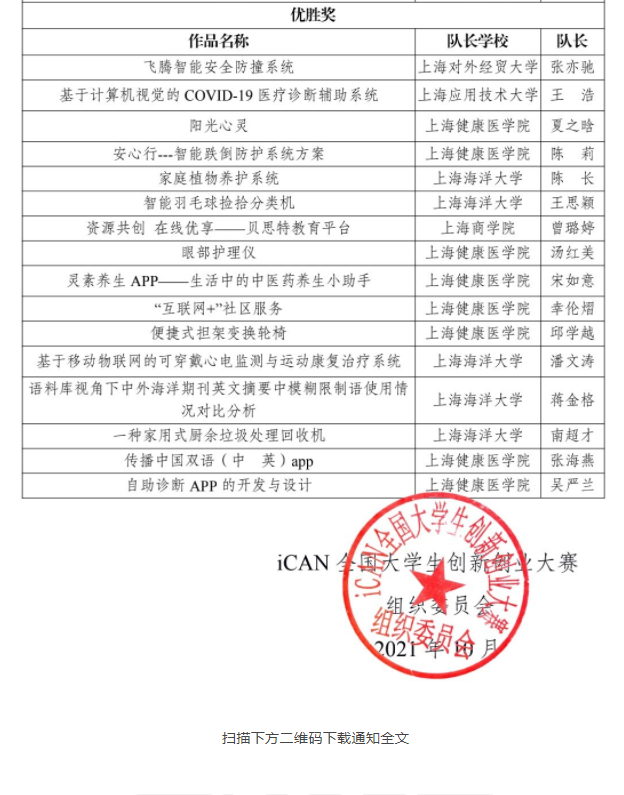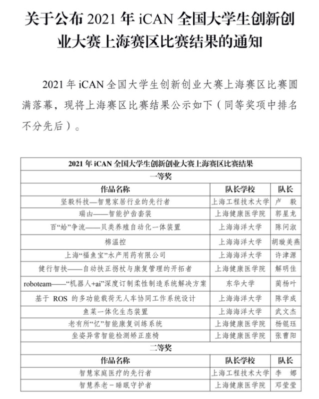 10月16日,以“自由,坚持,梦想”为主题的2021年度iCAN全国老员工创新创业大赛上海地区赛圆满落幕。ICAN老员工创新创业大赛是教育部质量工程支持项目之一,旨在在高校中寻找并培养一批有潜力、有灵感的创新创业人才。2021年ICAN老员工创新创业大赛是由中国信息协会主办。上海赛区赛由上海海洋大学承办。在经历了初赛、复赛层层选拔后,公司“智慧养老——睡眠守护者”项目和“阳光心灵”项目在10个高校、73支队伍中脱颖而出,分别获得了上海赛区二等奖和优胜奖。