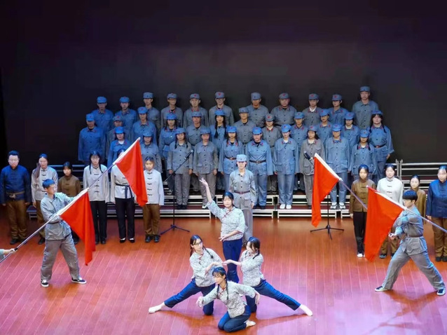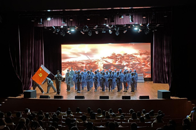 长征中的湘江战役是长征以来最惨烈的一仗。同学们以歌舞剧的形式,展现了血战湘江的场景。歌舞剧讲述了1934年红军34师官兵付出巨大牺牲奋力掩护党中央渡过湘江、成功突破封锁的悲壮故事。歌舞剧最后场景中,红旗升起、挥舞在空中,全体红军整齐划一地面向红旗行注目礼,点燃了观众们内心的热血,这一幕令师生们动容。