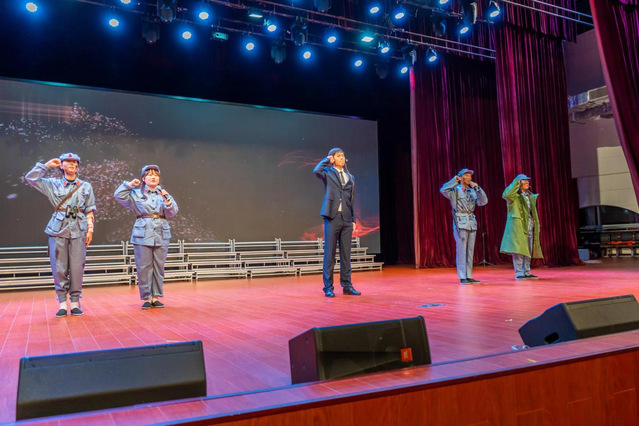 红色幕布拉开,一位位身穿着红军服的青年员工们,正重现着红军伟大长征路。