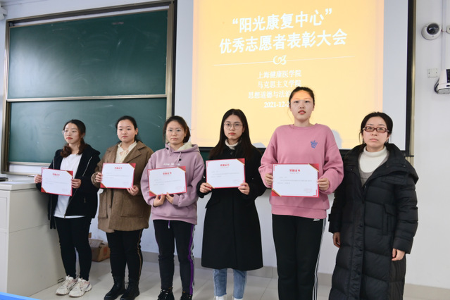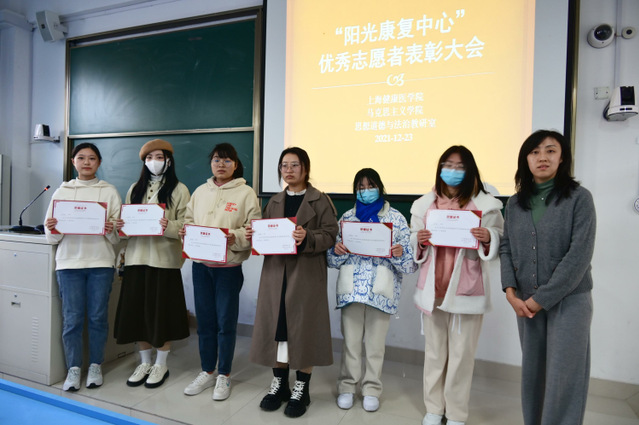 总结大会第二项议程是进行优秀志愿者表彰,付卓婧老师回顾了本学期两次阳光康复中心志愿者服务活动,播放了志愿者服务花絮,并与张静君老师一同为优秀志愿者颁奖。